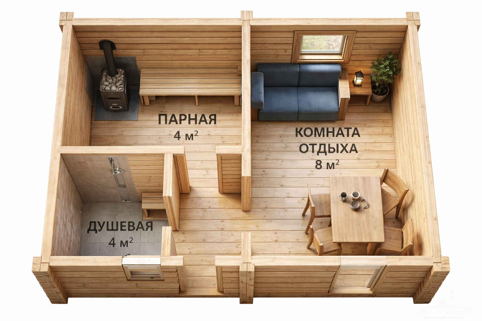 * Функциональность: Проект включает все необходимые помещения: парную, моечную, комнату отдыха и санузел. Всё продумано для вашего максимального комфорта.