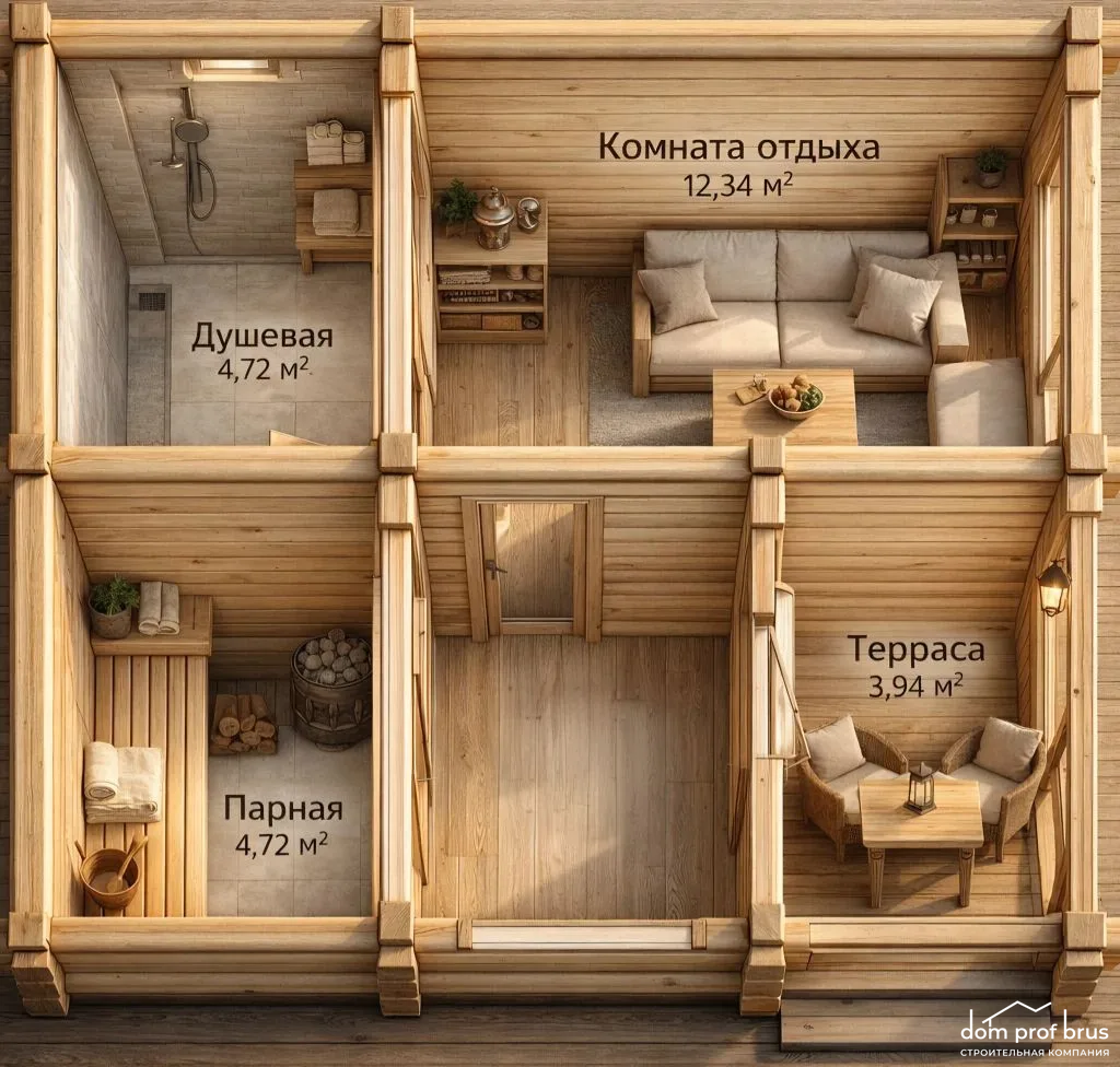 Проект бани 26 м² (6х5 м) из профилированного бруса – идеальное решение для комфортного отдыха с семьей и друзьями в Челябинске и Челябинской области! Этот уютный проект включает в себя всё необходимое для приятного времяпрепровождения:
