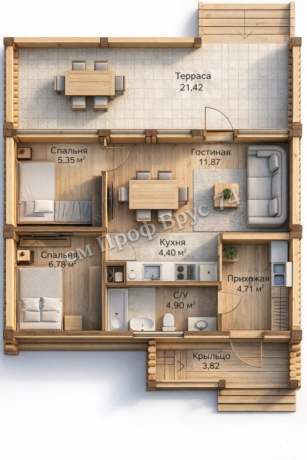 Планировка включает: крыльцо 3,82 м², прихожую 4,71 м², санузел 4,90 м², кухню 4,40 м², гостиную 11,87 м², спальню № 1 — 6,78 м², спальню № 2 — 5,35 м², террасу (опция) 21,42 м². Продуманная архитектура обеспечивает функциональность и удобство проживания.