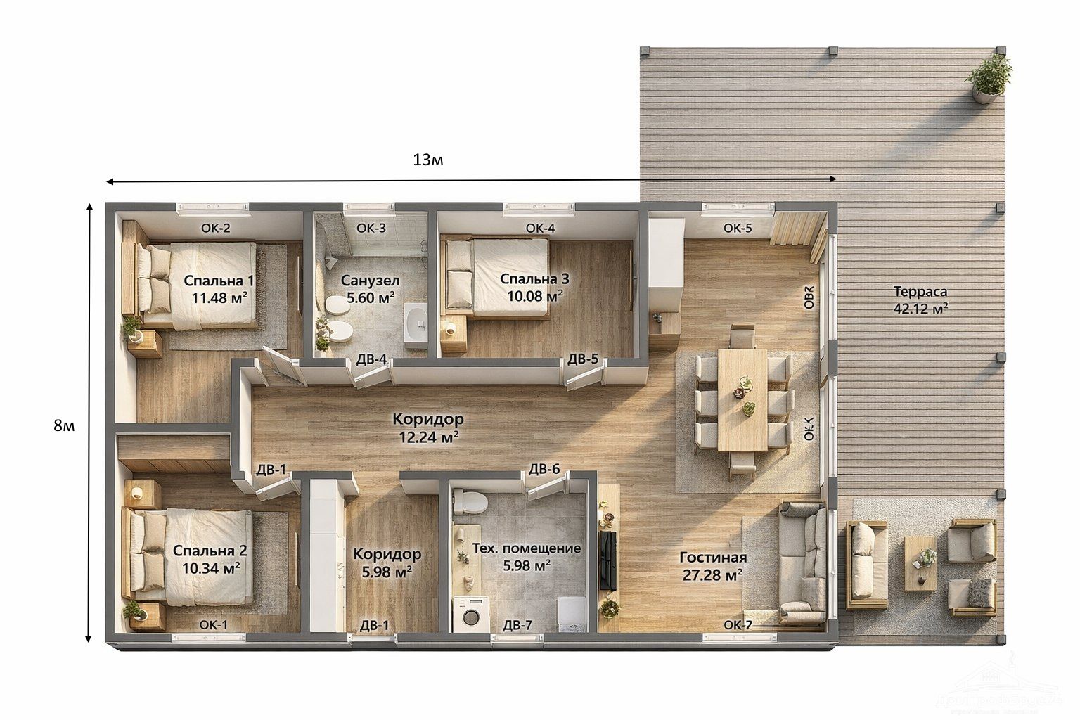 Каркасный дом «Южный» (13×8 м) — тёплое и функциональное жильё для семьи. Конструкция из сухой строганной доски по ГОСТ 8486-2021, обработанной антисептиком, отвечает нормам СП 31-105-2002.