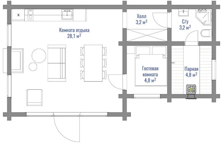 * Продуманная планировка: на площади 44 м2 гармонично разместились просторная парная, уютная комната отдыха, санузел и терраса.