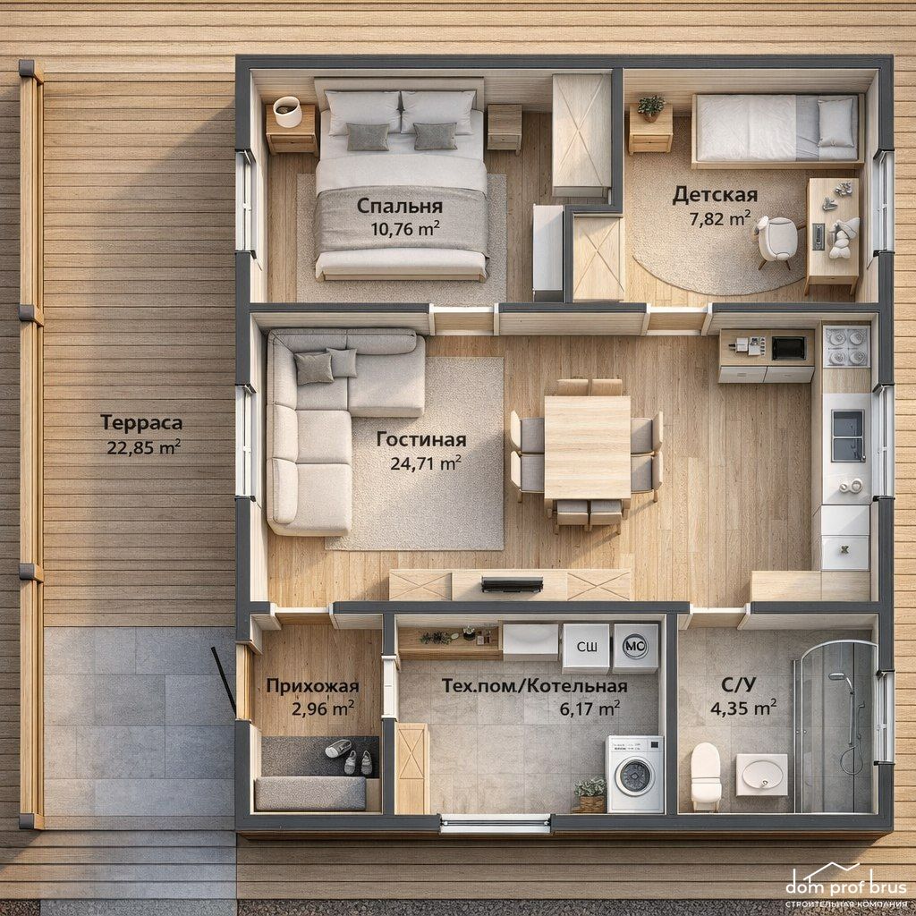 Площадь 79,6 м² включает гостиную, детскую, спальню, санузел, тех. помещение/котельную и террасу (22,85 м²).